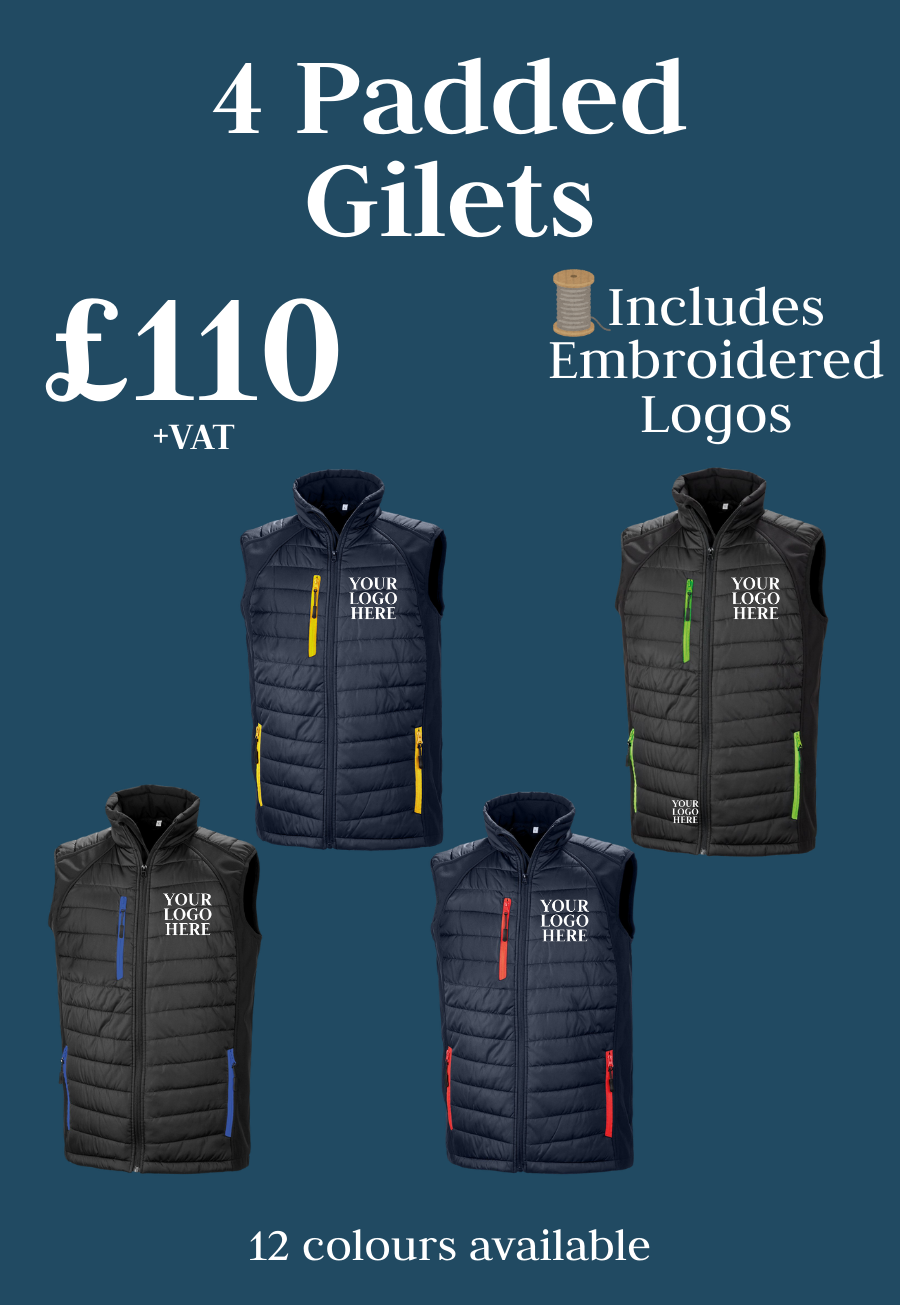 Our 4 Padded Gilet R238X Bundle is perfect for layering, providing core warmth without the bulk. All embroidered with your company logo.