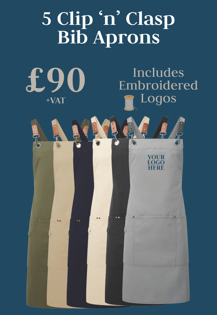 A Bundle of 5 Clip n Clasp Bib Aprons, with 6 colours to choose from. Each include your logo embroidered front centre. A beautifully styled apron with exquisite design features. Cross-back in its design, the apron straps are constructed in a self-coloured herringbone weave and attached to the apron through eyelets with clasps.