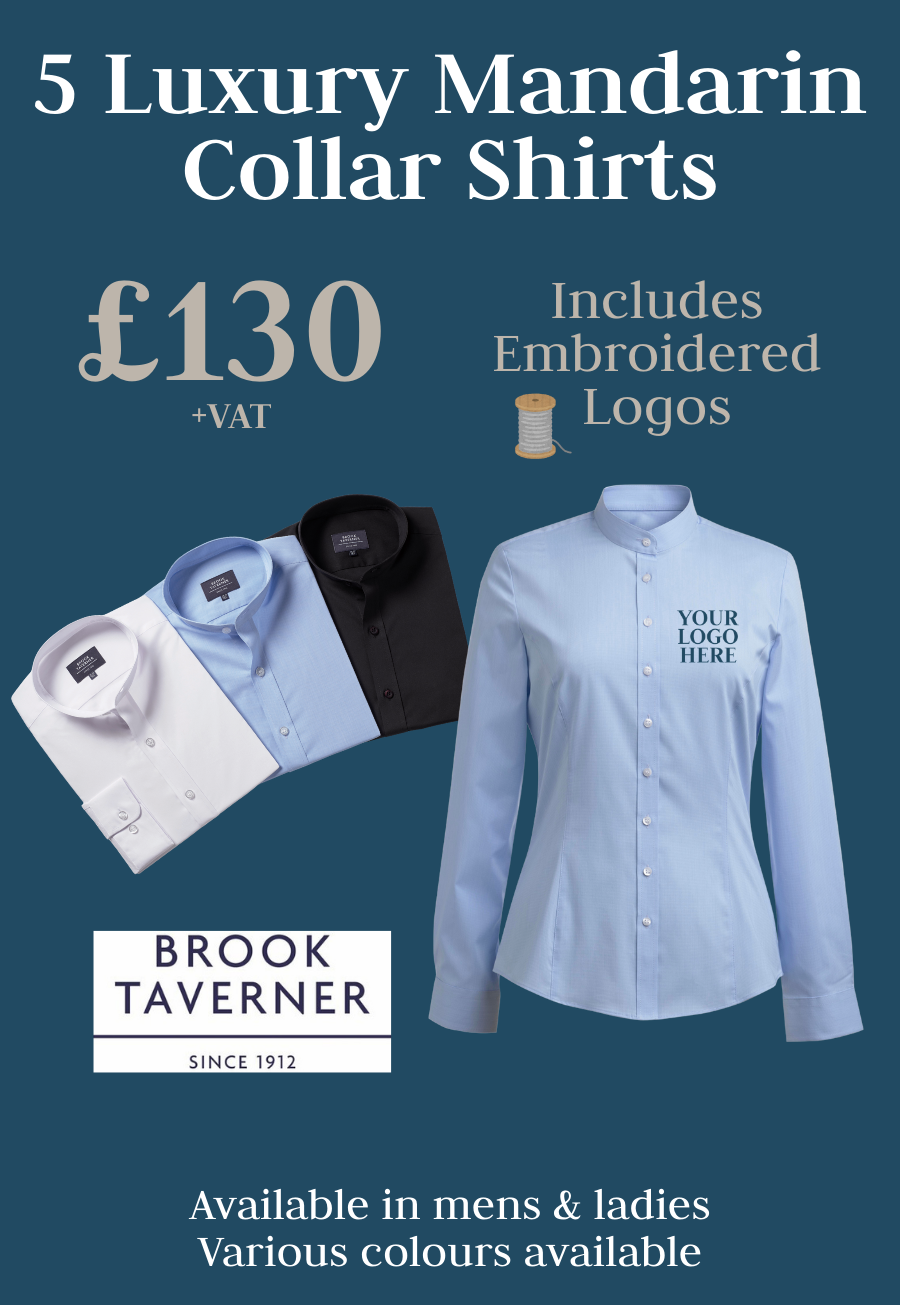 A Bundle of 5 Luxury Mandarin Collar Shirts in either black, white or sky blue, male or female. This shirt offers a modern style that is perfect for businesses who want a more contemporary uniform for their staff, or professionals who wish to upgrade their work wardrobe.